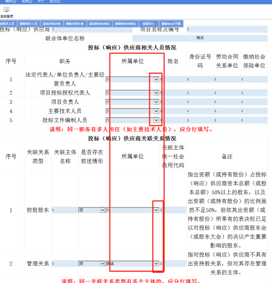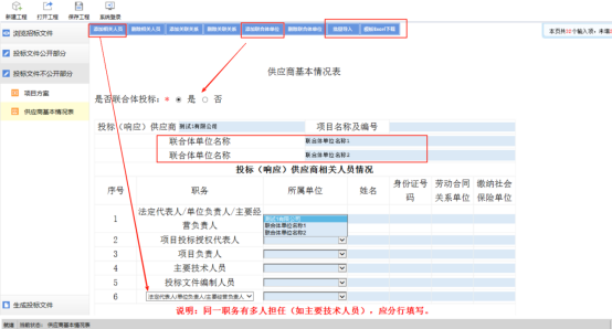 5.4.2 联合体投标的,注意5供应商相关人员情况 -联合体、6供应商关联关系情况 -联合体 的“所属单位”要和4供应 商-项目信息 -联合体中的联合体一一对应上。